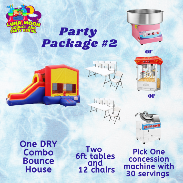 Table 6-Foot-Seats 6Package 2:Table 6-Foot-Seats 61Dropdown21782137_17067481100 Luna Moon Bounce and Party Rental offers table and chair rentals for added convenience.