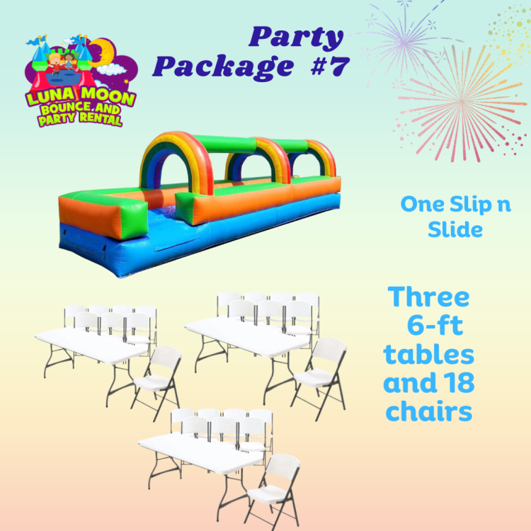 Table 6-Foot-Seats 6Package 7:Table 6-Foot-Seats 61Dropdown21941201_17067481100 Luna Moon Bounce and Party Rental offers table and chair rentals for added convenience.